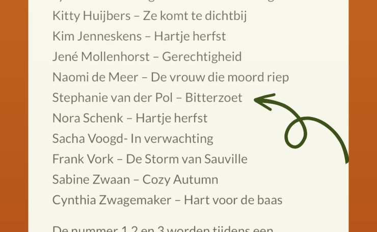 Op 6 september mag ik naar de feestelijke bijeenkomst in Amersfoort waar de winnaar bekend wordt gemaakt. De winnaar die dus een uitgeefcontract krijgt, hoe supertof zou het zijn als ‘Bitterzoet’ daadwerkelijk wordt uitgegeven? Ik duim dus nog zo’n anderhalve week flink maar vooral blijf ik nog even genieten van het feit dat ik de longlist heb gehaald!
