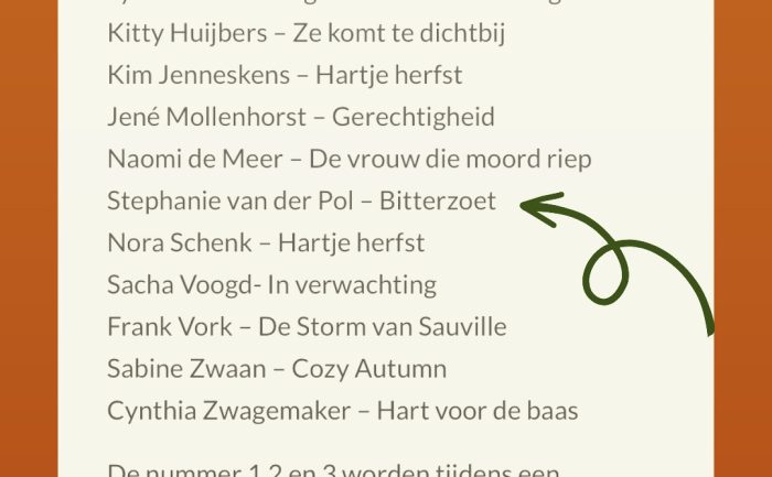 Zwetende handjes had ik toen ik eind juni op de knop ‘verzend e-mail’ klikte. Mijn inzending ‘Bitterzoet’ voor de Cozy & Crime schrijfwedstrijd was verstuurd: een feelgood novelle met het …